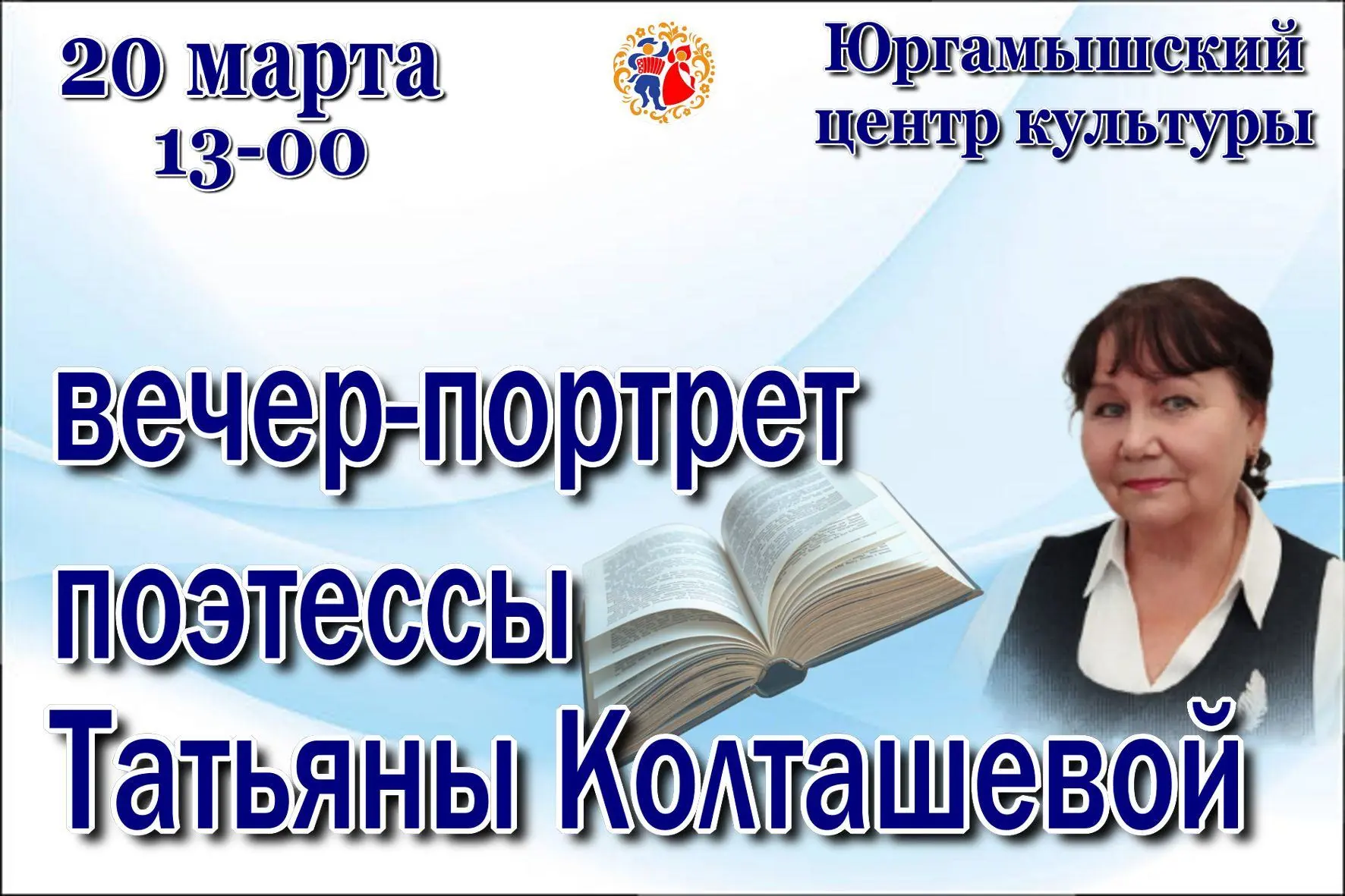Этот вечер обещает стать ярким и незабываемым событием для всех ценителей высокой поэзии. Мы приглашаем вас в удивительный мир, созданный талантом и душой выдающейся женщины.Вместе мы проследим вдохновляющий творческий и жизненный путь юргамышской поэтессы Татьяны Колташевой. От первых робких строк до глубоких, наполненных смыслом произведений – каждый этап будет представлен с любовью и вниманием. Вы узнаете, что вдохновляло поэтессу, какие события и люди нашли отражение в ее стихах. Это будет возможность увидеть не только творца, но и человека, чья жизнь сама по себе является поэмой.